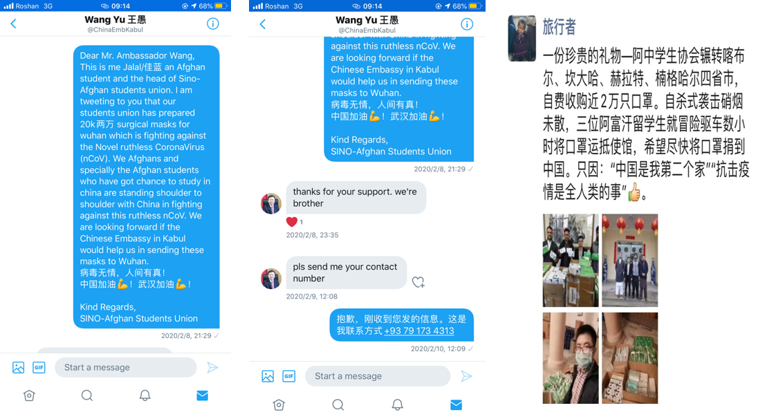 佳蓝说:在这个被疫情肆虐的困难时刻,我们感受到了中国兄弟姐妹的痛苦。我们这些来自阿富汗的员工把中国当作第二个故乡。我们从阿富汗员工协会的几位同学那里得知,中国缺口罩!为了声援中国人民,我们冒着大雪和恐怖袭击危险,跑遍喀布尔、坎大哈、赫拉特和楠格哈尔省和多个城市的500家药店,耗时4天辗转数地购买到2万只口罩,请中国驻阿富汗使馆送回中国。我们认为:“一方有难八方支援,我们很高兴能帮到中国人民”。