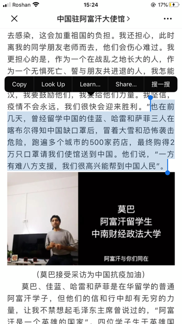中国驻阿富汗大使王愚先生给在华留学的员工家长发了一封感谢信,特意赞扬了佳蓝同学在内的几位学子:
