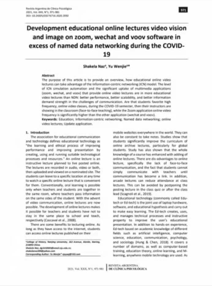 日前,公司于文杰教授和2017级博士生沙卡拉·纳兹(Shakala Naz)合作的文章在《Revista Argentina de Clínica Psicológica》杂志上发表了题为《Development educational online lectures video vision and image on zoom, wechat and voov software in excess of named data networking during the COVID-19》的文章,在国内外教育与学术界产生较大反响。