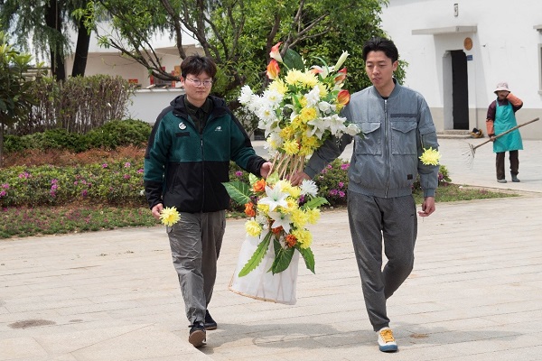 结束村内的参观后,许汝南和张康代表全体同学向革命烈士纪念碑敬献花篮。全体同学怀着对革命烈士无比的崇敬和思念之情,肃立默哀并向烈士纪念碑献花。